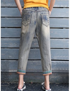 Letters Embroidery Elastic Waist Casual Denim