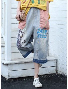 Cartoon Embroidery Distressed Pockets Casual Denim